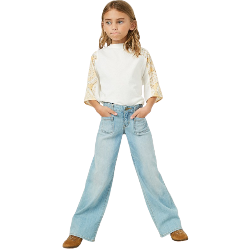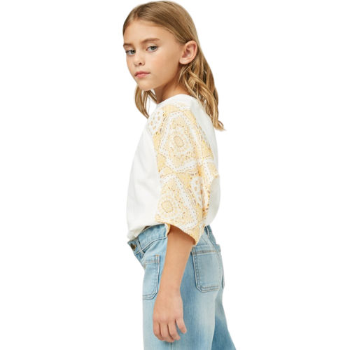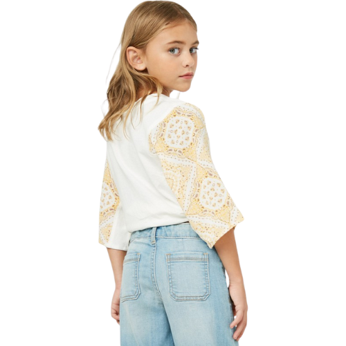 Girls' oversized sleeve top features a breathable stretch fabric with printed sleeves and a high-low hemline.