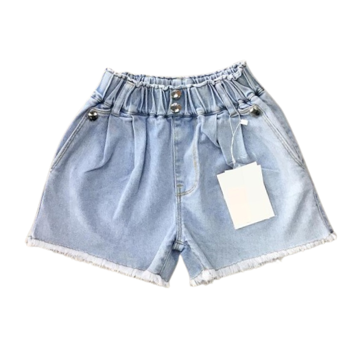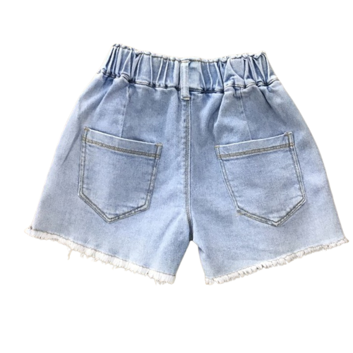 Blue jean denim shorts with tiny fringe bottoms and silver buttons. Added key chain erasers attached to belt loop.
