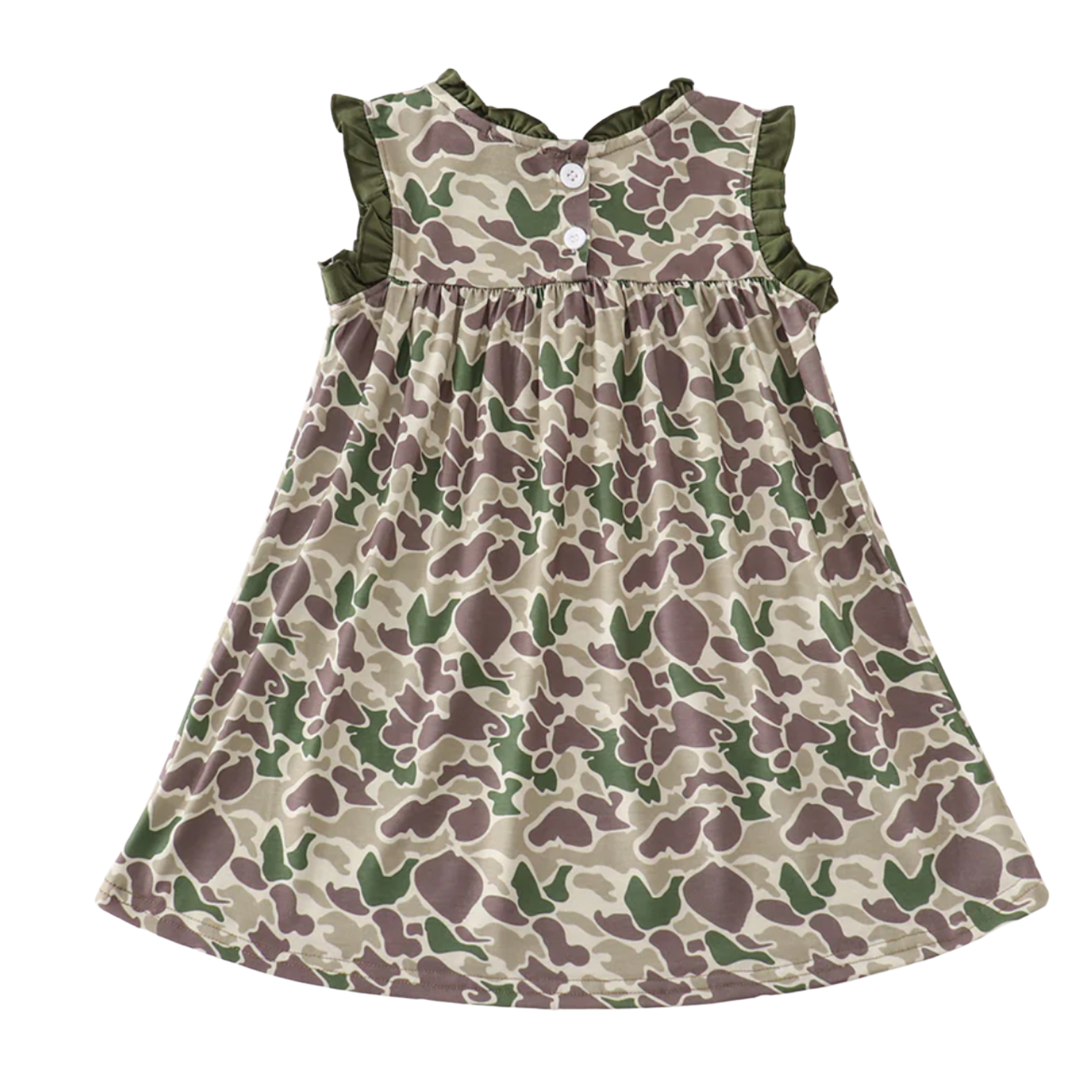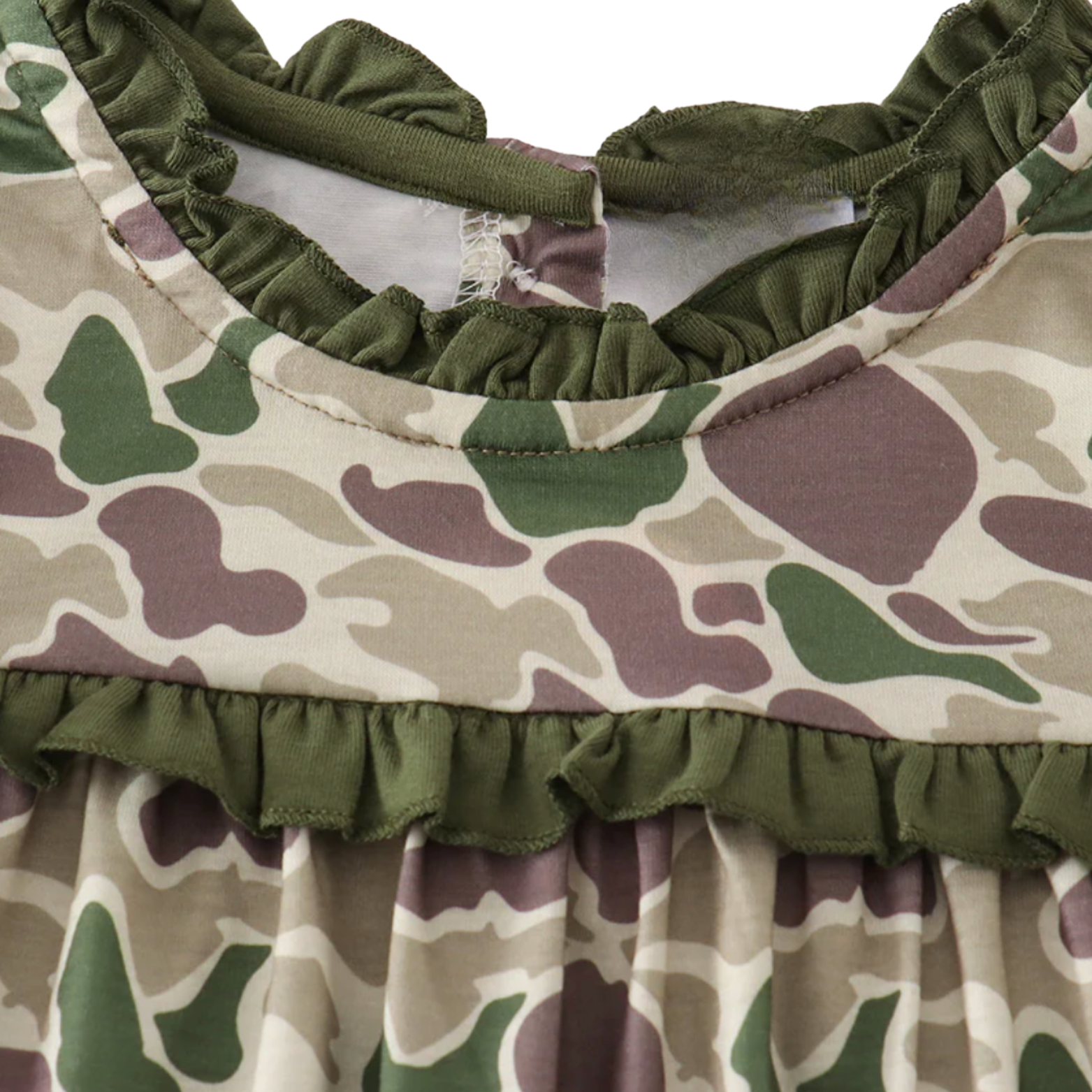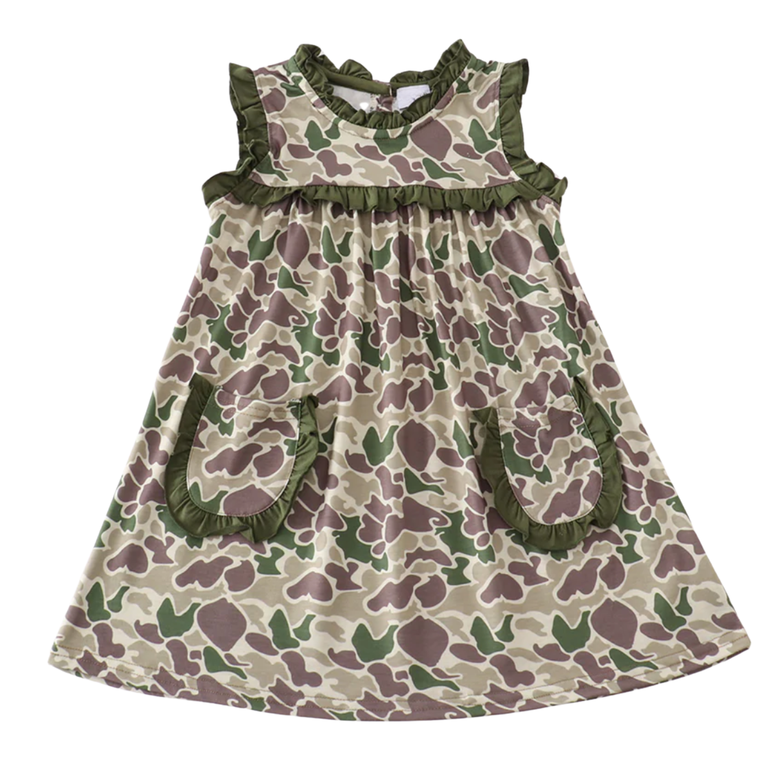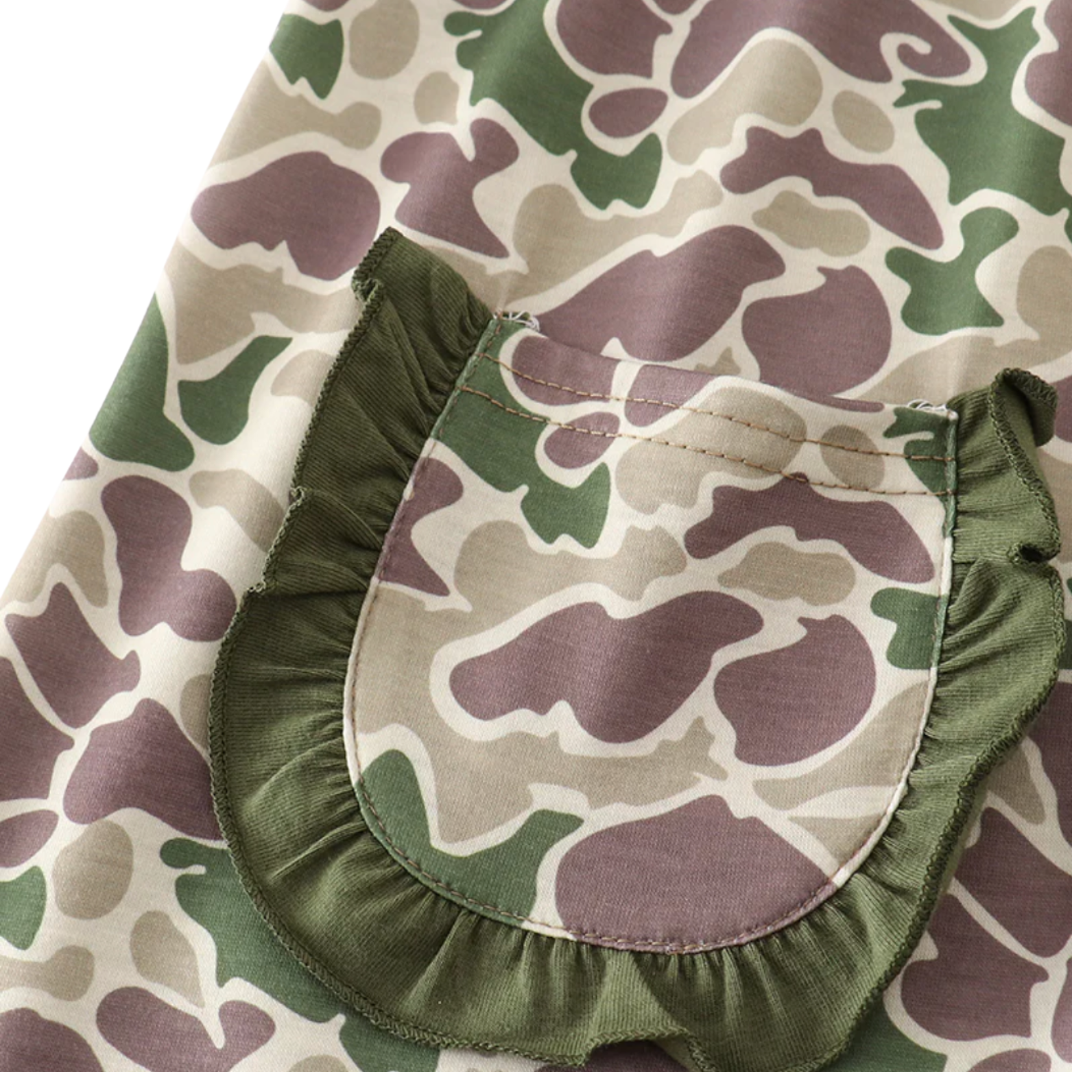 This army fatigue style dress features a sleeveless design and charming ruffle trim on the pockets. Crafted from a blend of 50% cotton and 50% spandex, it offers both comfort and style. Perfect for any occasion, this dress effortlessly combines functionality and fashion.