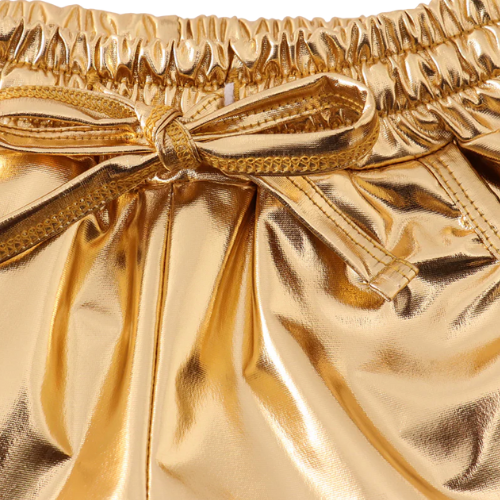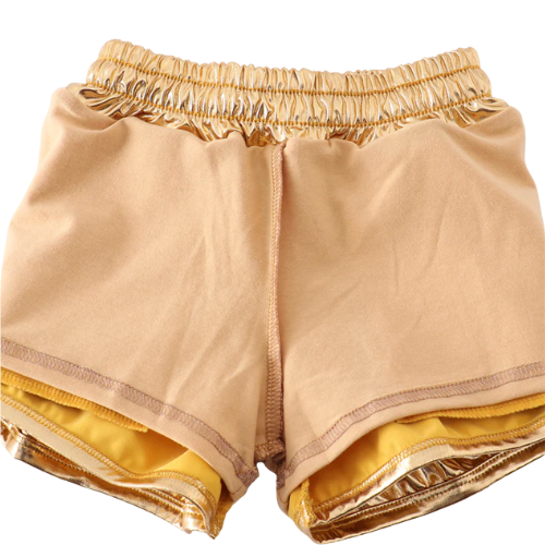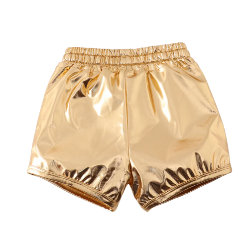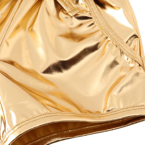 Elevate your wardrobe with the Licorice Luxe Shorts, crafted from 100% polyester for a comfortable, durable fit. Featuring a vibrant gold hue enhanced by a striking metallic laser design.