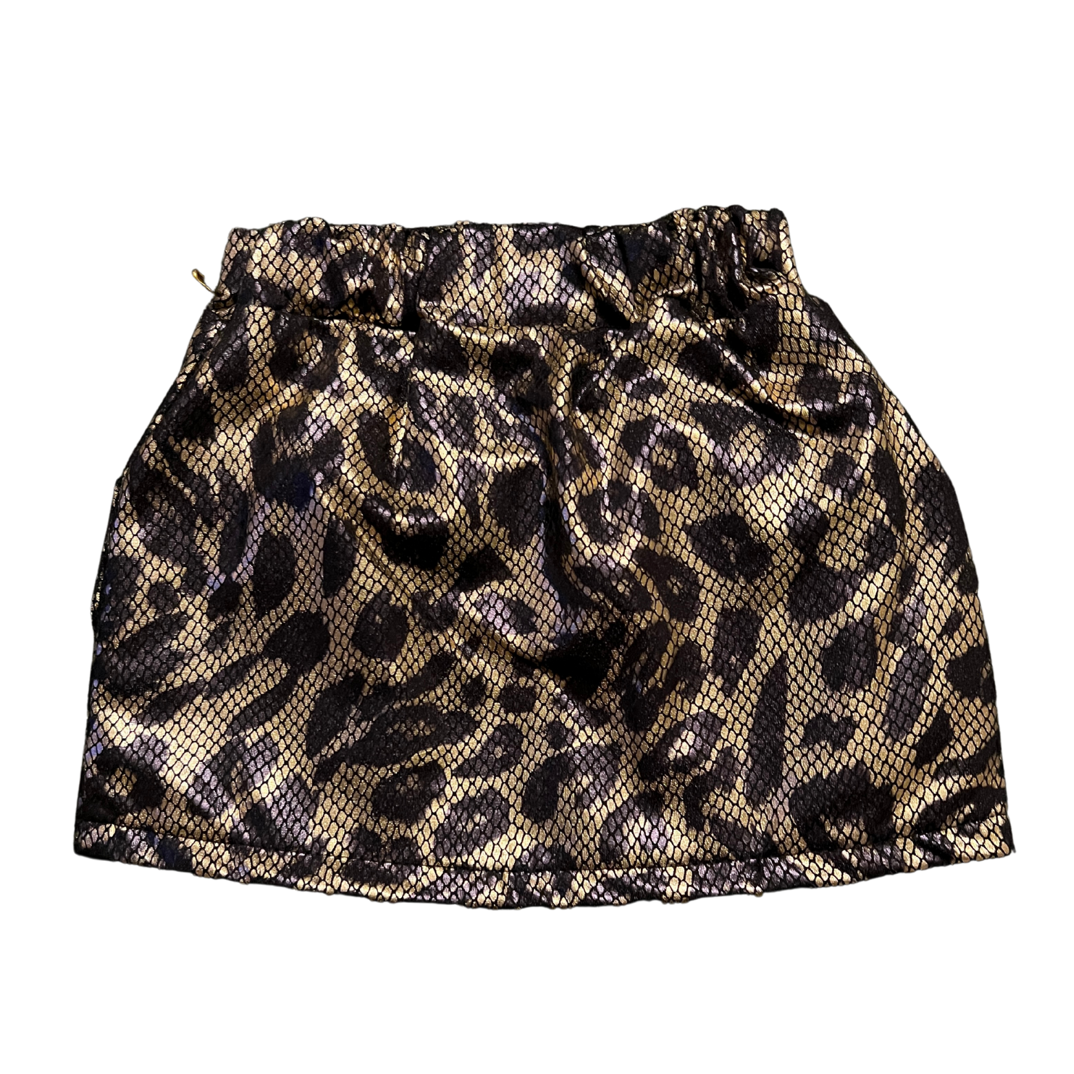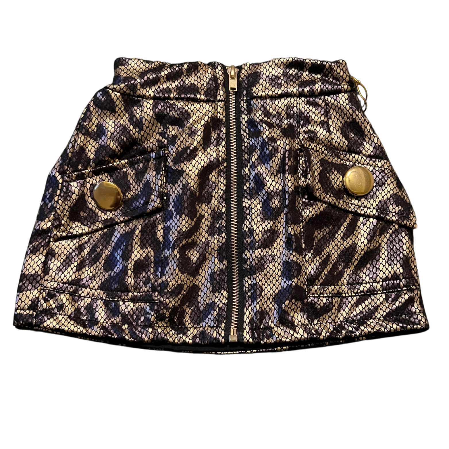 Metallic leopard printed gold and black skirt with zip up front and button pockets