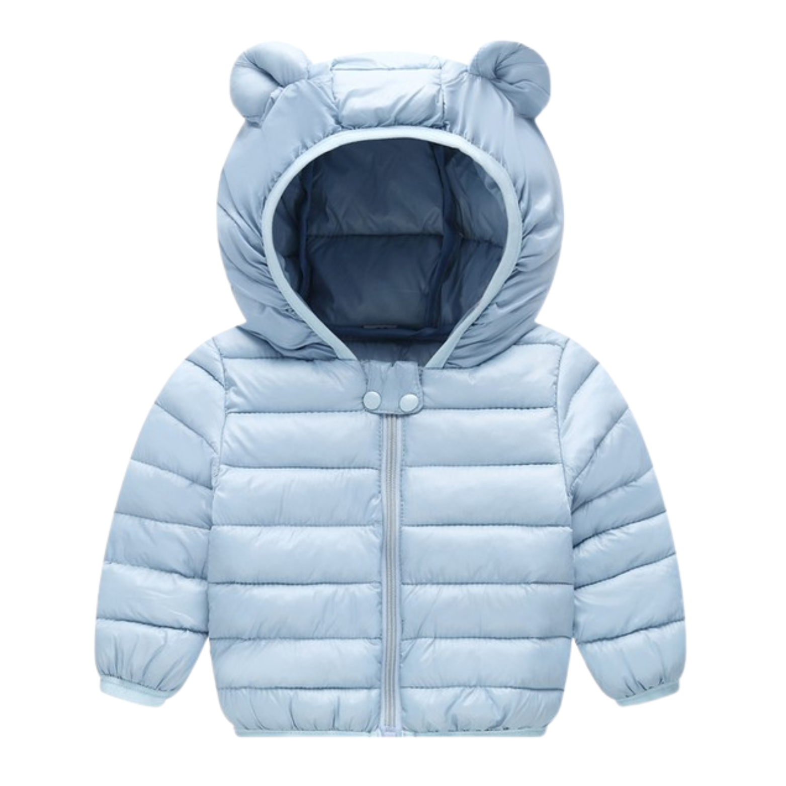 Light Blue Bubble Coat with Zipper and Bear Ears on Hood
