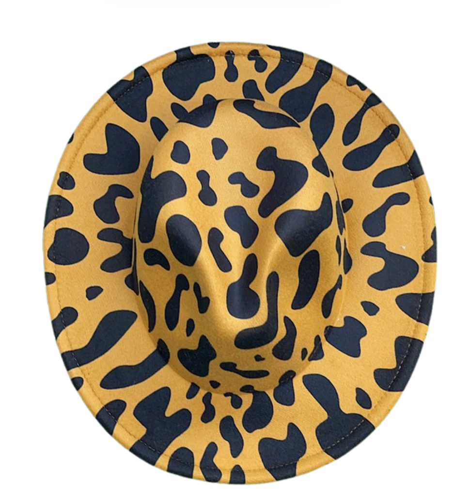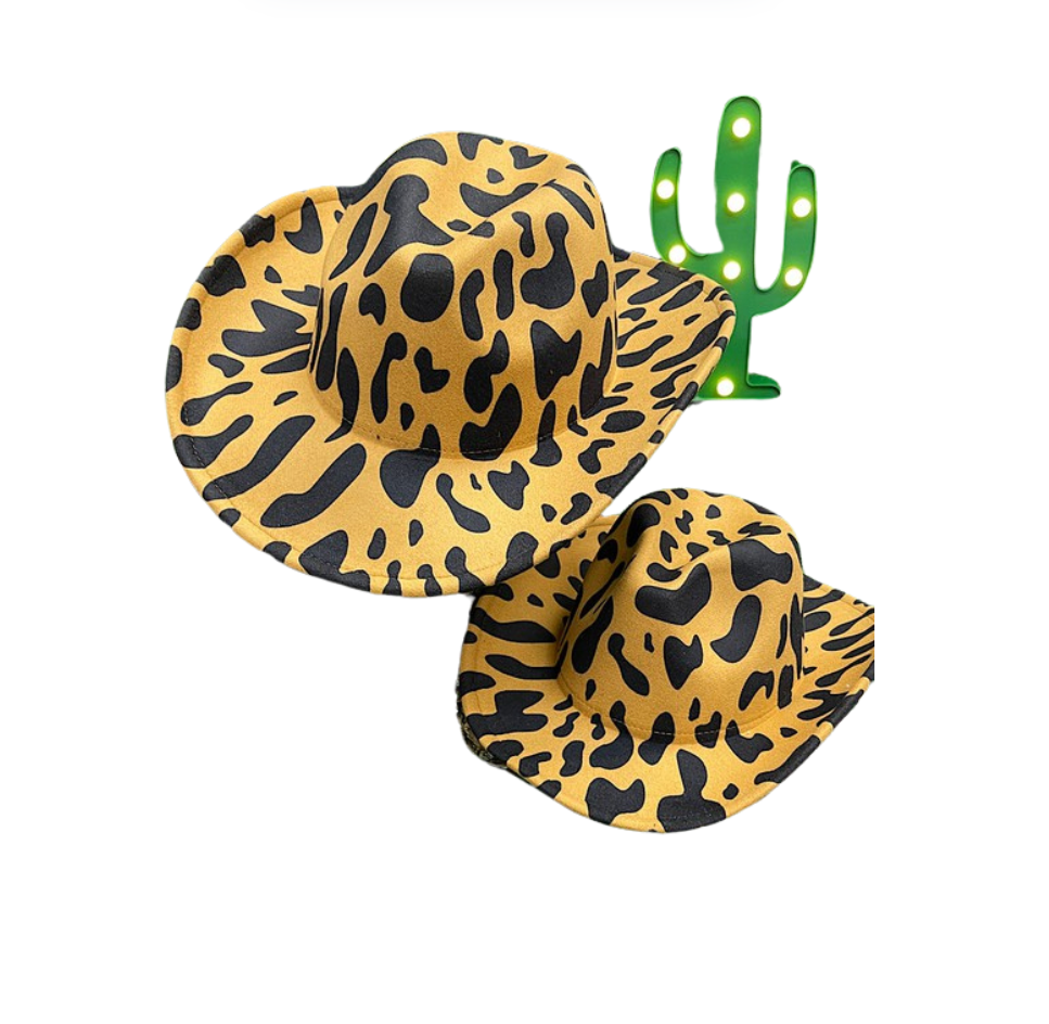 Cow-girl hat featuring a distinctive cow-print pattern in caramel and black.