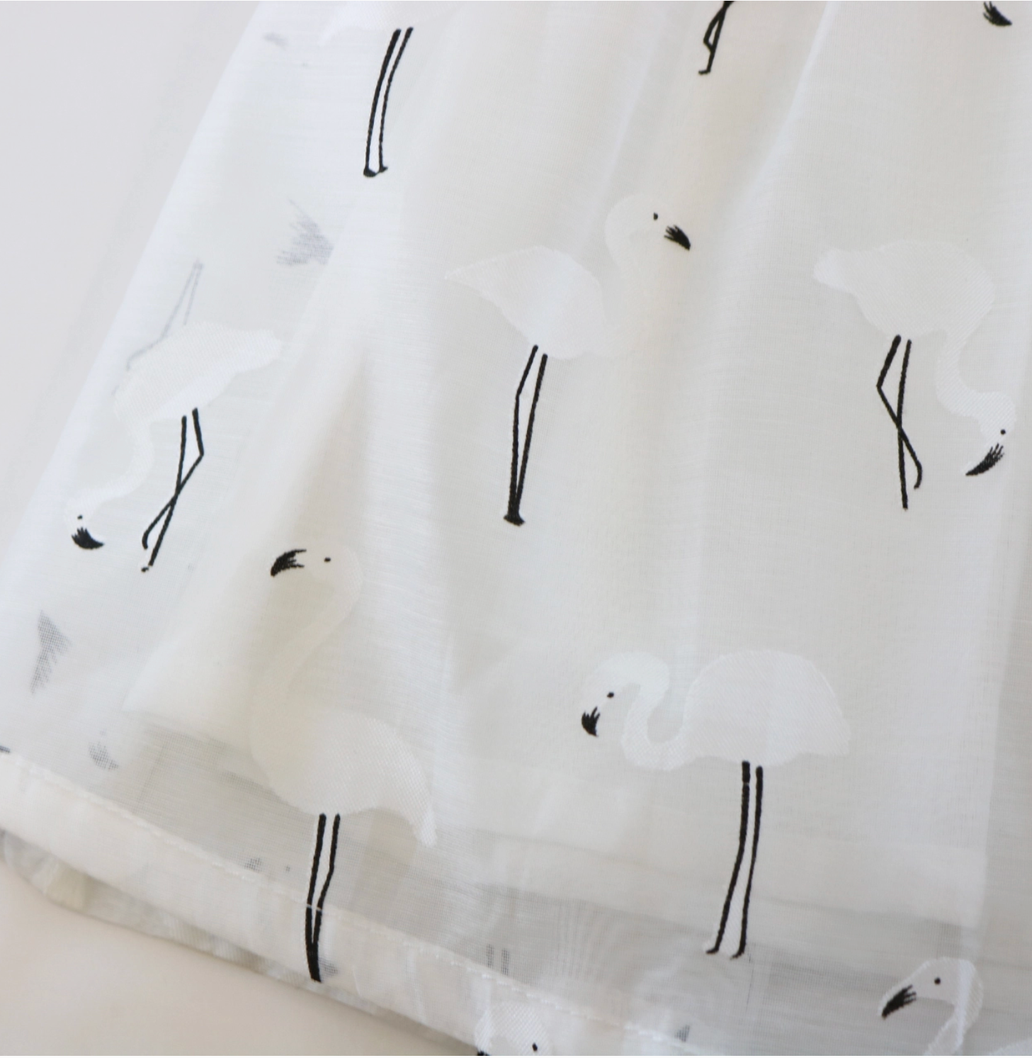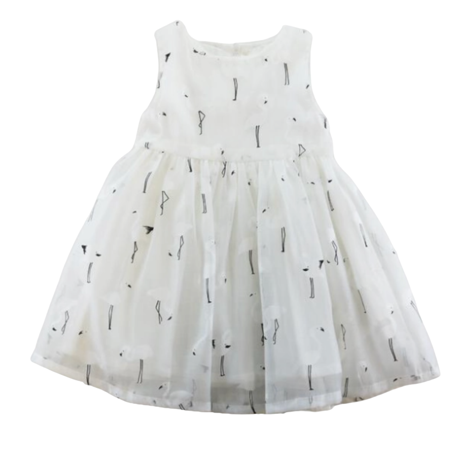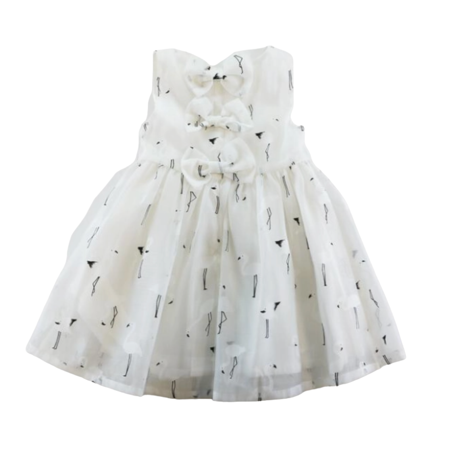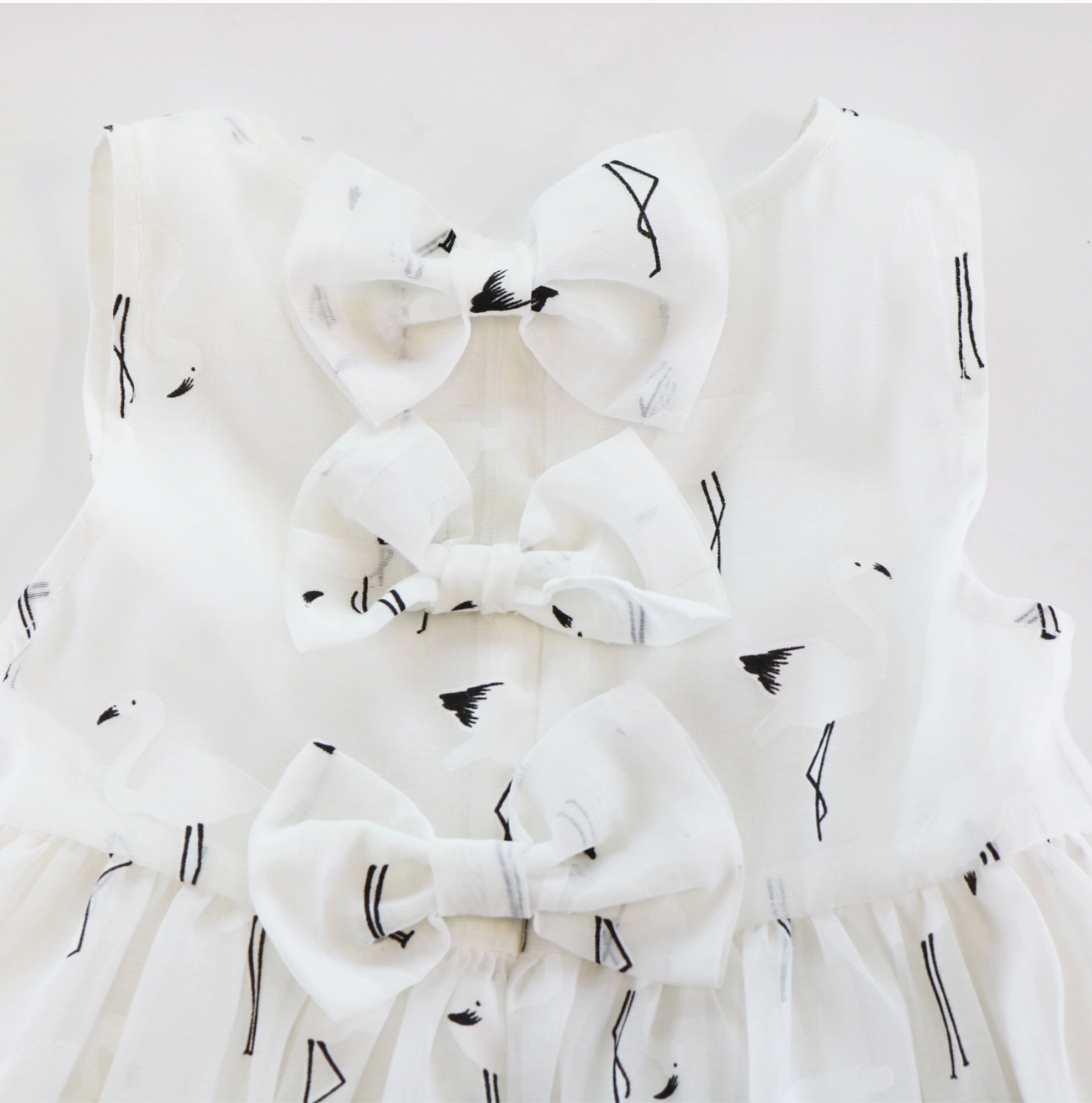 The Oreo Dress is a stunning addition to any wardrobe. Its white color is accentuated by charming flamingos and delicate bows on the back. Perfect for any occasion, this dress is sure to make you stand out in style. Add a touch of elegance to your look with this unique piece.