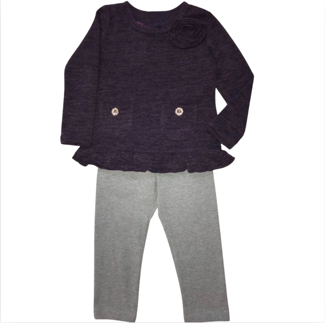 Two-piece purple ruffle trim shirt with gold button and grey tights.