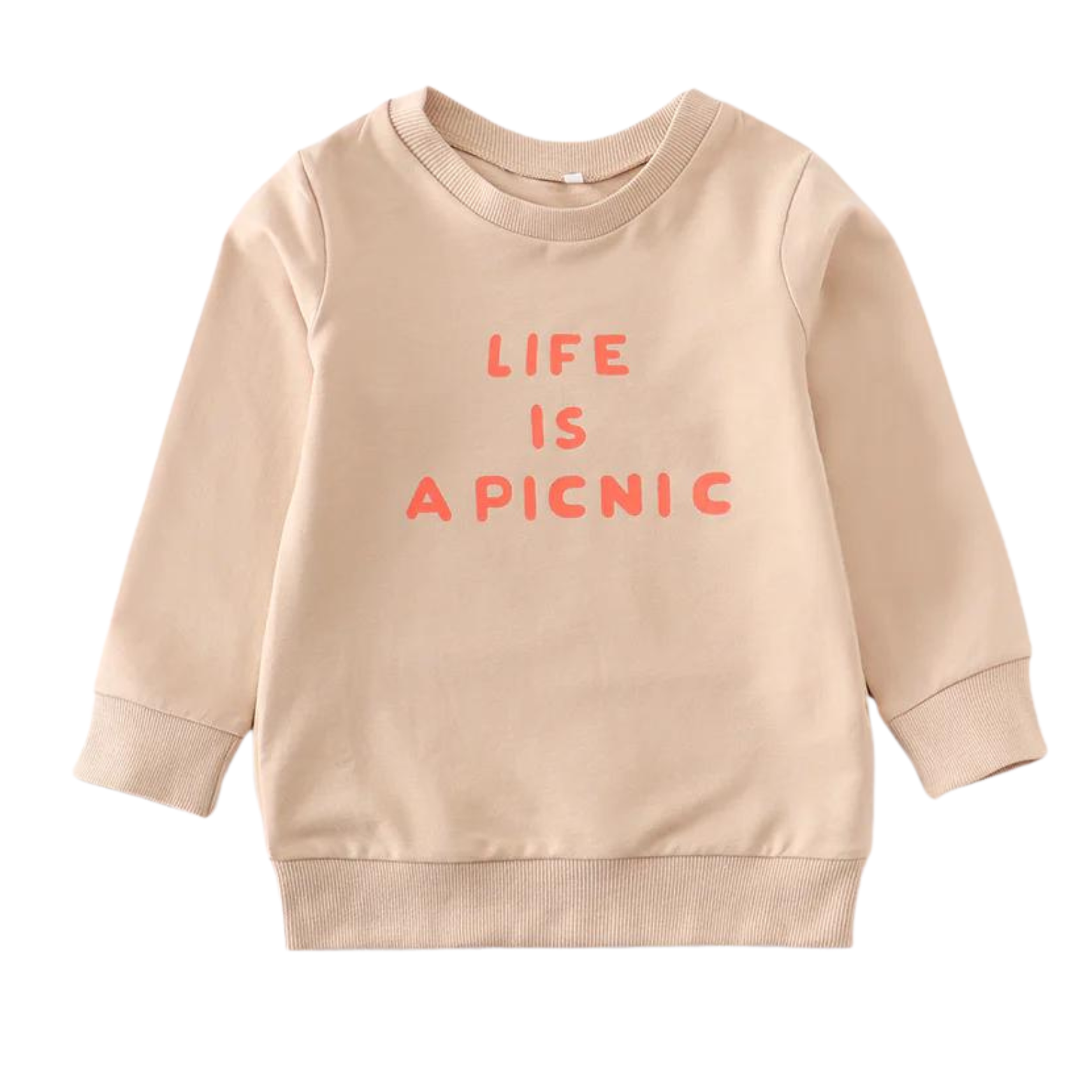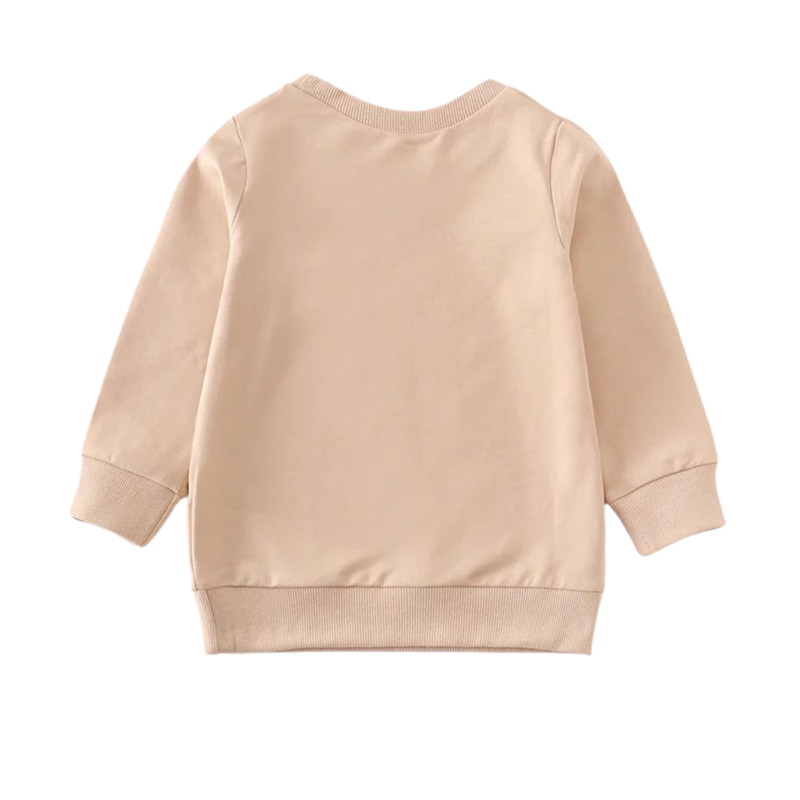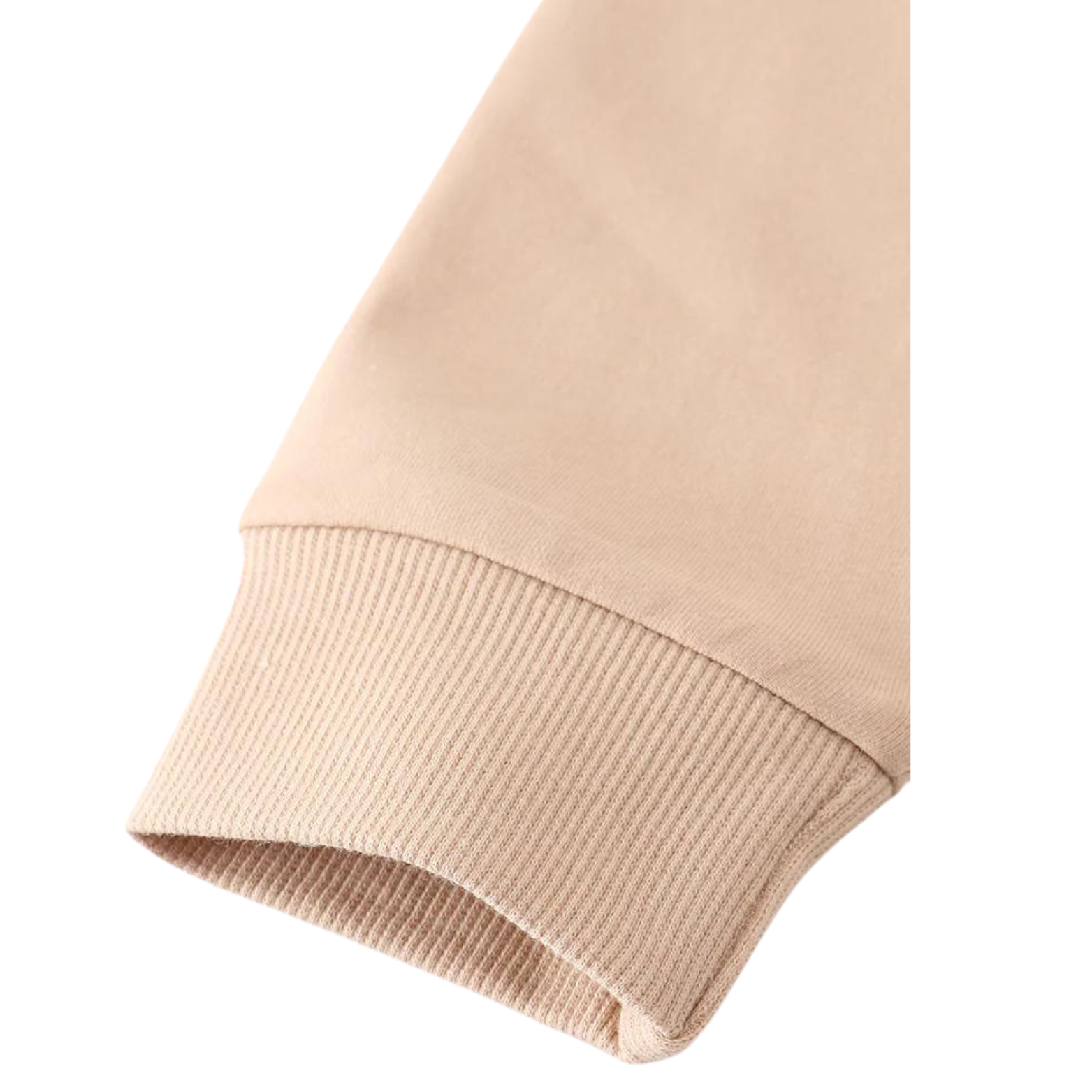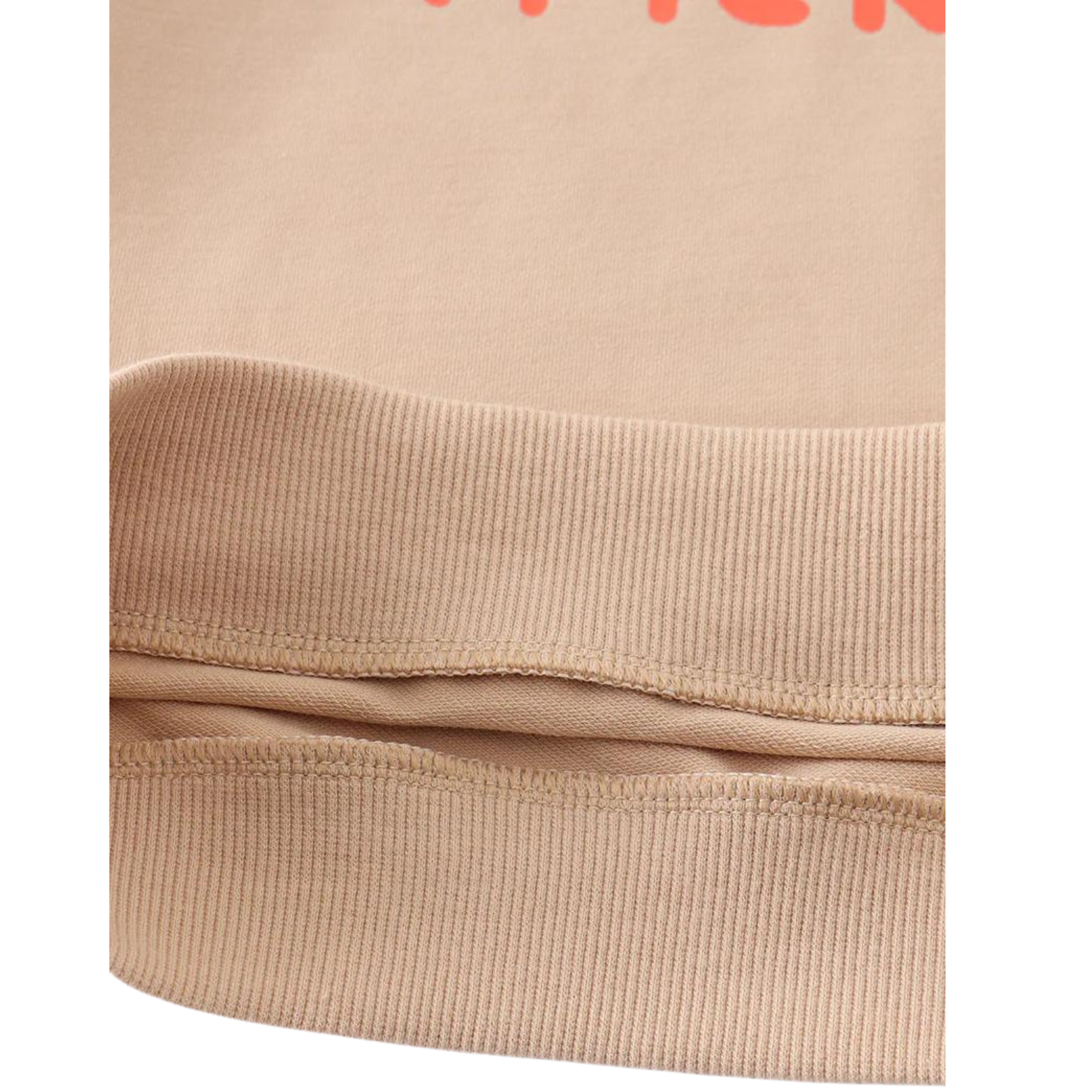 Beige sweater with orange wording Cold Wash|Do Not Bleach|Tumble Dry Low|Iron Medium Heat